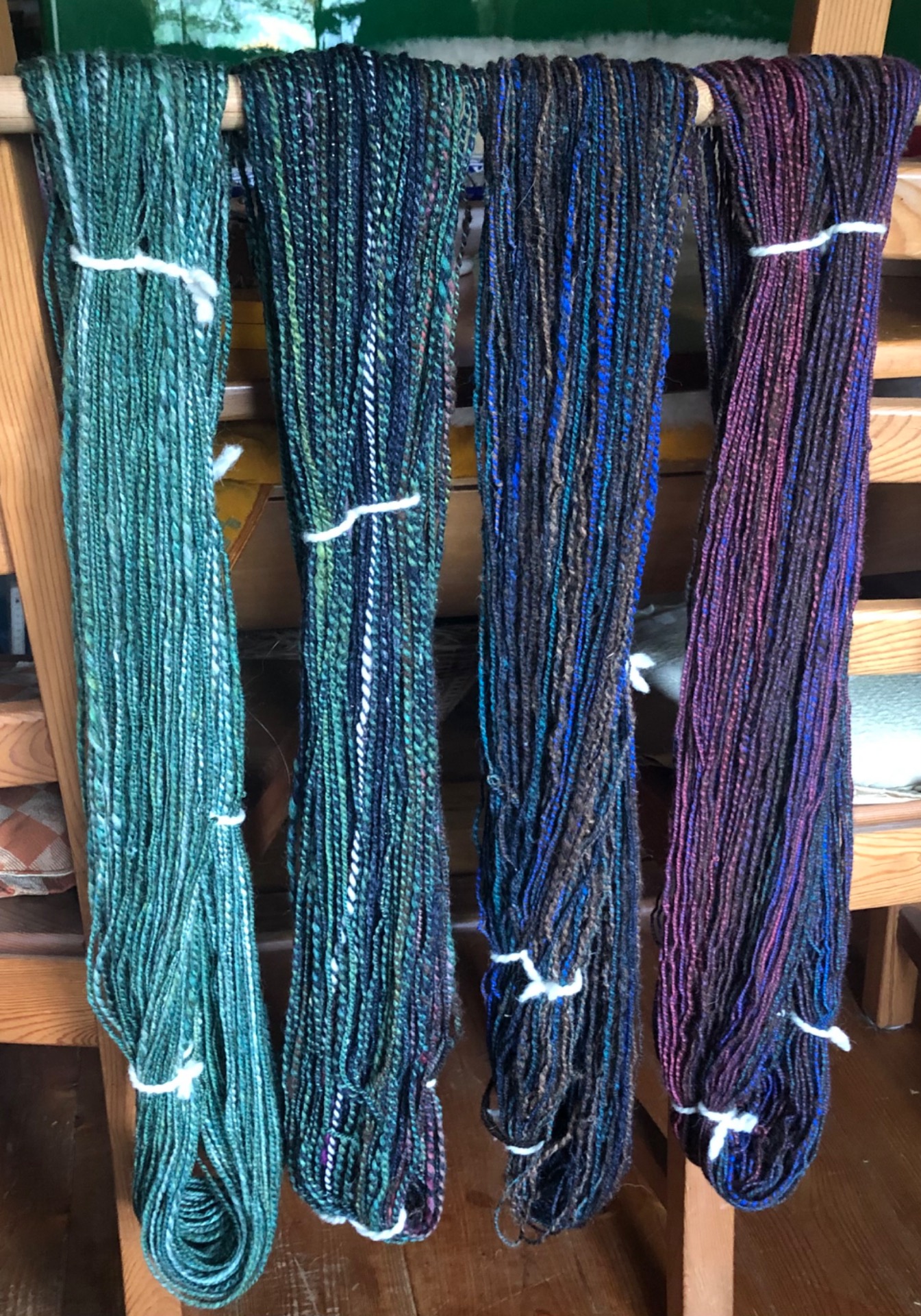 Handgesponnene und manche auch Handgefärbte Wollstrangen. Ich liebe es, einfach nach Gefühl buntes Garn herzustellen.